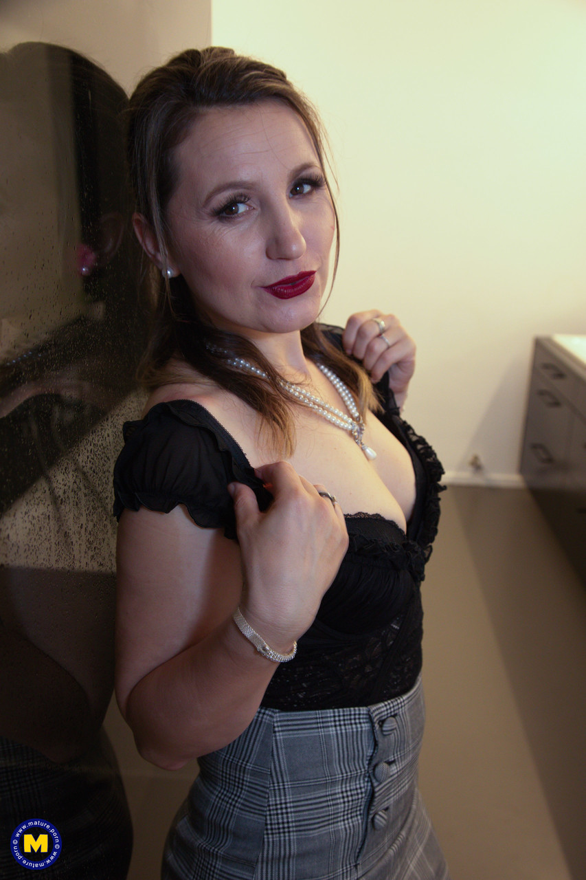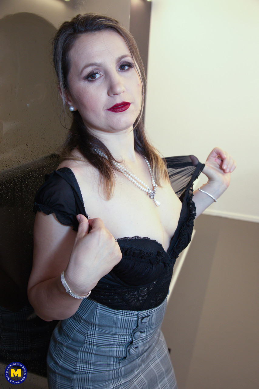 35 летняя милфа в чулочках показывает свои натуральные сиськи и круглую попку в соло фотосессии