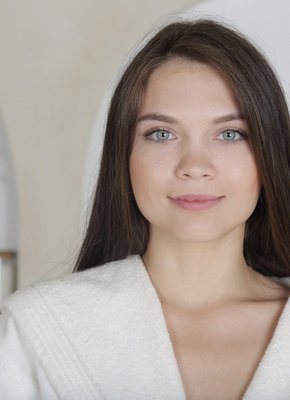 Описание: Заперевшись в ванной комнате и соблазнительно медленно стянув с себя длинный халат, молодая голая девица эротично опускается перед нами на пол и с широко раздвинутыми ногами во всей красе демонстрирует нам свою бритую промежность, игриво теребя пальчиками розовую киску с нежными половыми губками.