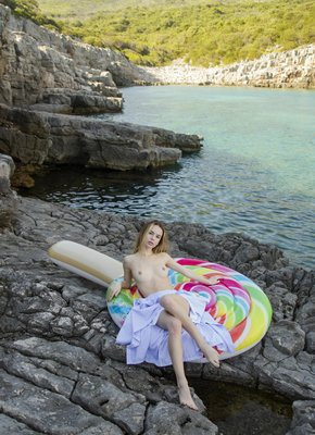 Описание: Совершенно не стесняясь фотографирующей ее камеры и постепенно сняв с себя всю одежду, развратная голая девица с миниатюрными натуральными сиськами возбуждающе раскрыла свою бритую промежность на общественном пляже и, чувственно извиваясь всем телом на надувной игрушке, открыто предлагает поглазеть на ее самые интимные места.