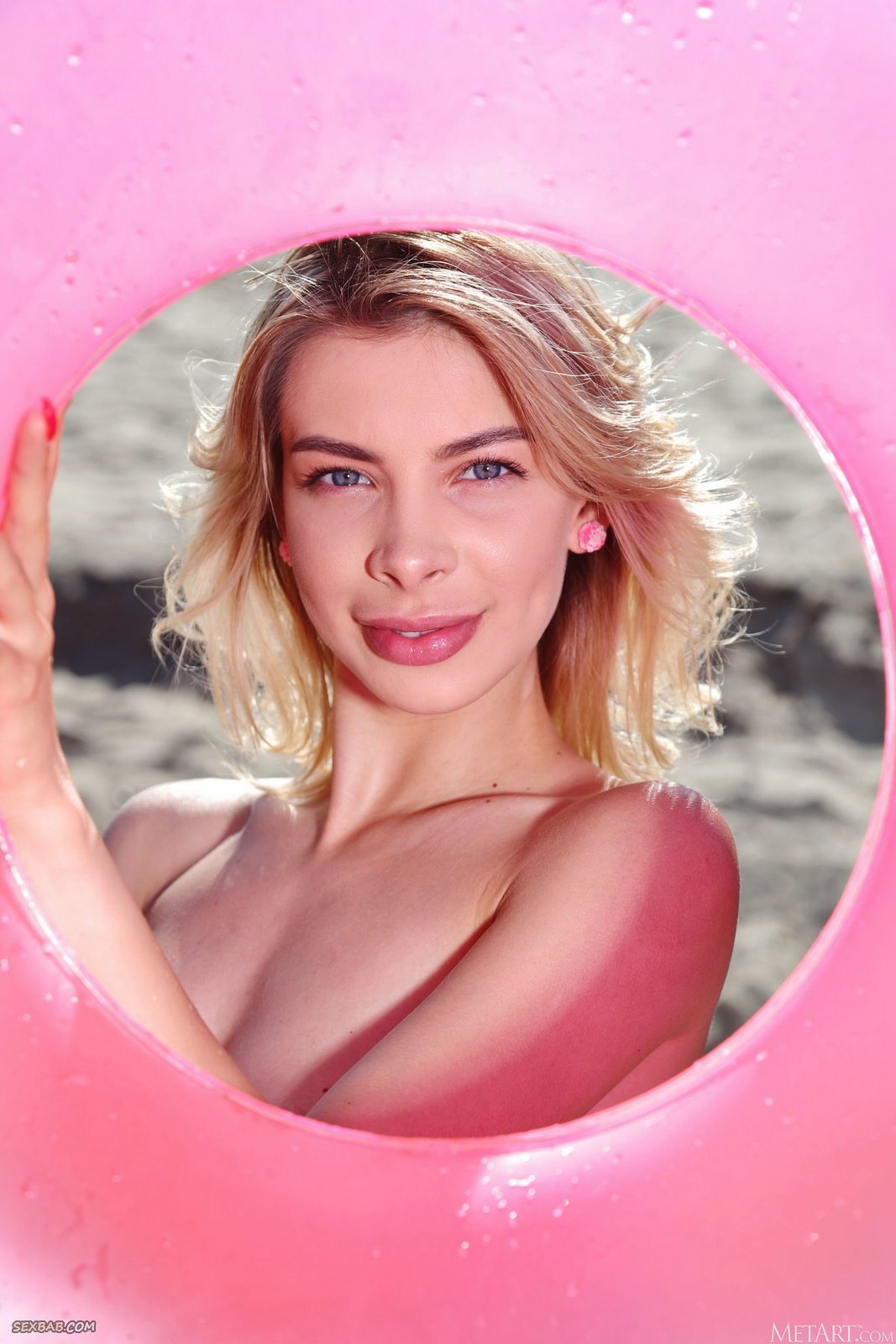 Блондинка с голыми сиськами позирует на пляже