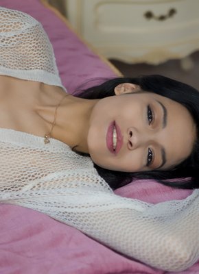 Описание: Игриво прикрывшись прозрачной кофточкой, миниатюрная смуглая детка разлеглась перед камерой на большой кровати и на показ ласкает пальчиками свою бритую розовую пизду. Обнаженная брюнетка с маленькой грудью совершенно ничего не скрывает и возбуждающе извивается всем телом в самых откровенных позах.