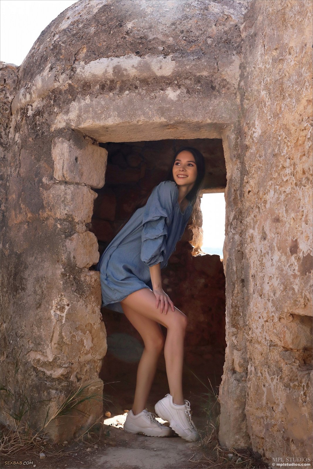 Описание: Гуляя по заброшенным развалинам, активная бесстыжая девица без белья игриво и на показ задрала перед камерой свое короткое свободное платье и открыто засветила свои голые прелести. Худощавая брюнетка с голыми миниатюрными титьками высоко задирает свои длинные ноги и с разных ракурсов раскрывает нам свою бритую розовую киску.