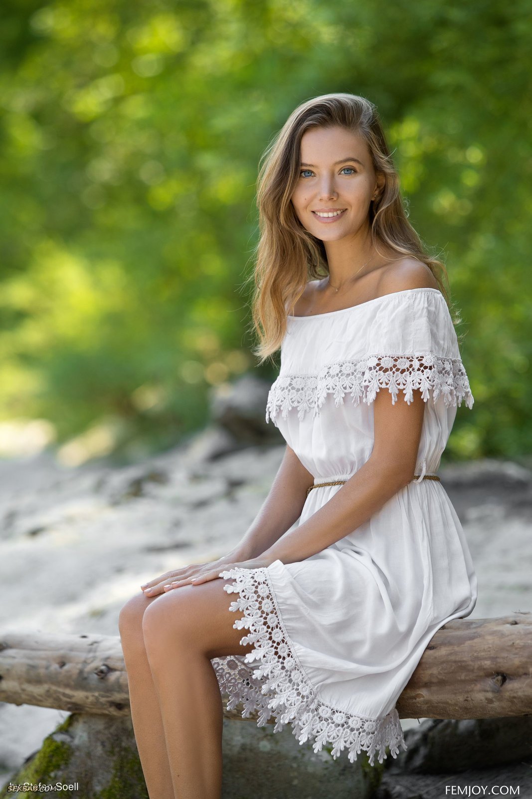 Описание: Обаятельная стройная девушка, скинув белое платье под которым не было нижнего белья, улыбается и эротично позирует на фоне природе. Наслаждая свежим воздухом, сексуальная красотка с натуральными возбужденными сиськами часто раздвигала промежность, и делала акцент на гладеньком лобке с бритой писькой.