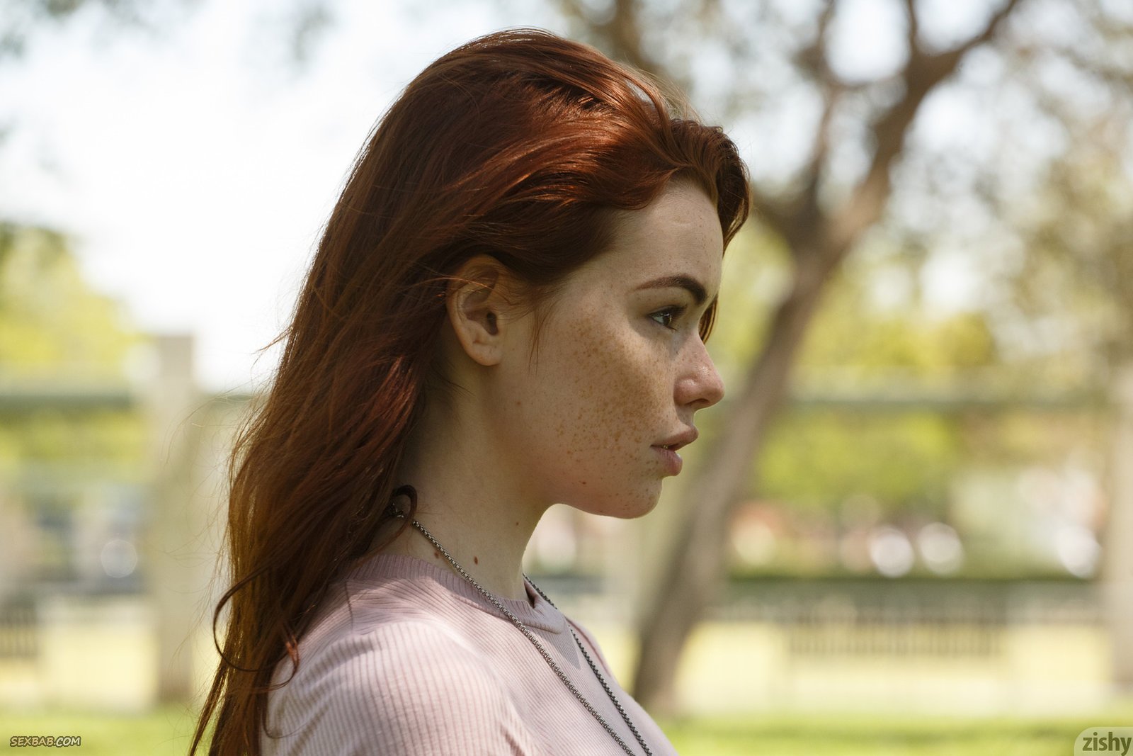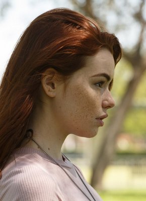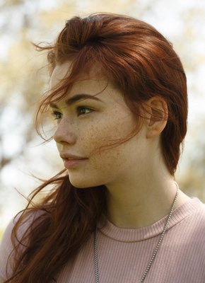 Рыжеволосая девушка с веснушками гуляет на улице