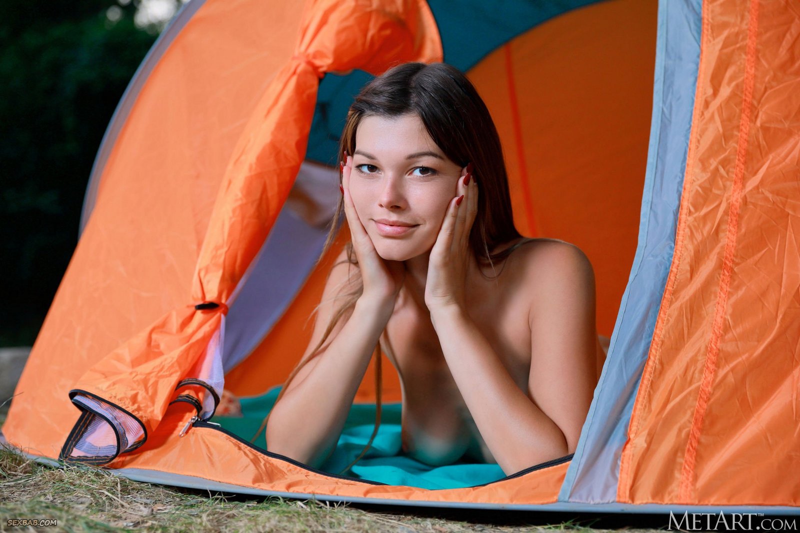 Голая туристка позирует в палатке на природе