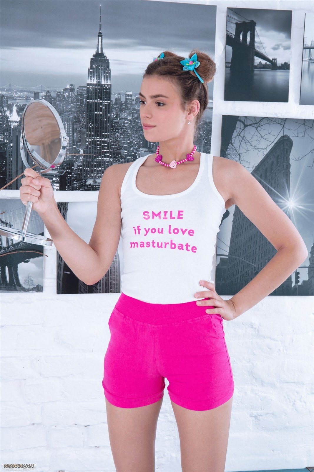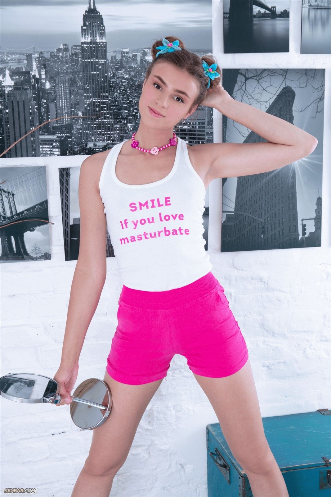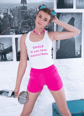 Описание: Очаровательная милая детка игриво снимает с себя домашнюю одежду и белые трусики и тщательно рассматривает свою бритую письку в зеркале. В большой кровати молодая девица с маленькими титьками разлеглась с широко раздвинутыми ногами и разводит пальчиками нежные сладкие половые губы, чтобы изучить узкую влажную щелку в отражении.