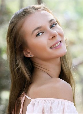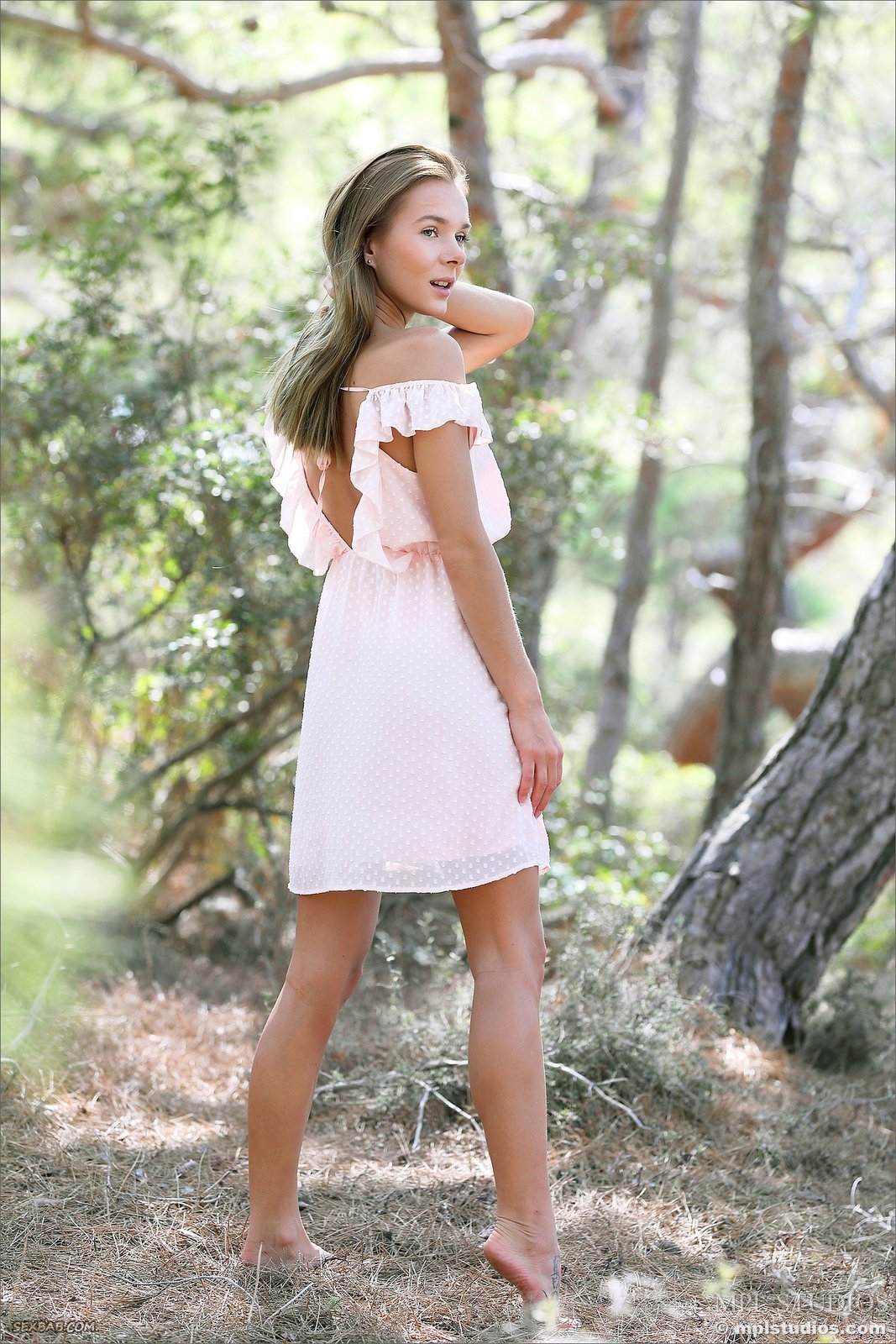 Описание: Молоденькая нежная нимфа с худенькой фигурой в коротком платье без нижнего белья прогуливается по лесу и мило улыбается. В будущем сексуальная девушка все же приподняла юбку и сделала акцент на аккуратной попочке и гладко выбритой письке, а оголившись полностью засветила маленькие сиськи.