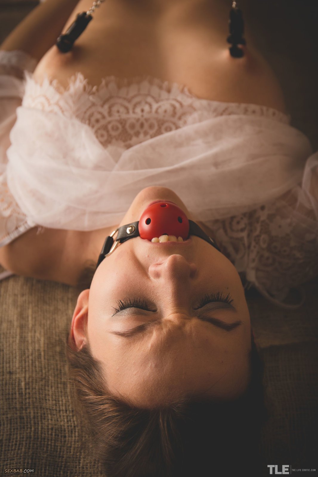 Описание: Похотливая нимфоманка с большим кляпом во рту залезла рукой в свои прозрачные трусики и страстно дрочит сочную волосатую письку. Оголив свои натуральные титьки и нацепив на чувствительные соски две прищепки, возбужденная девка громко кричит от переполняющий ее эмоций и горячо извивается всем телом на кровати.