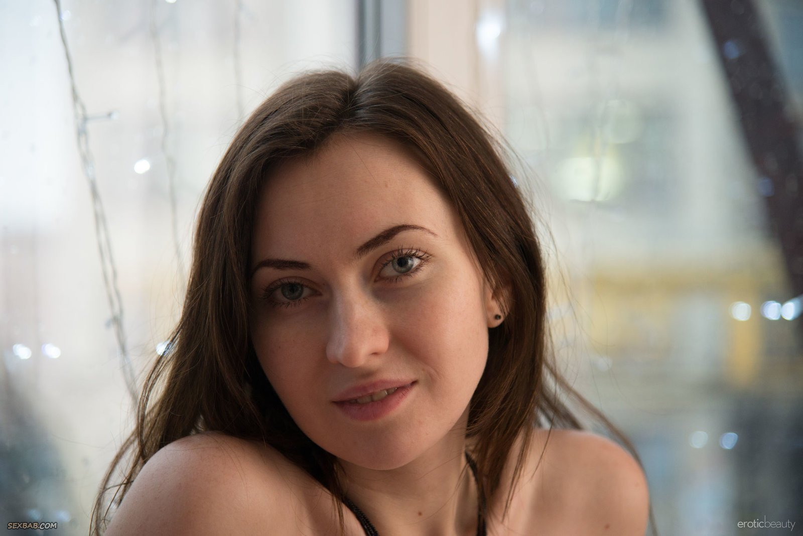 Баба в нижнем белье позирует у окна