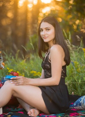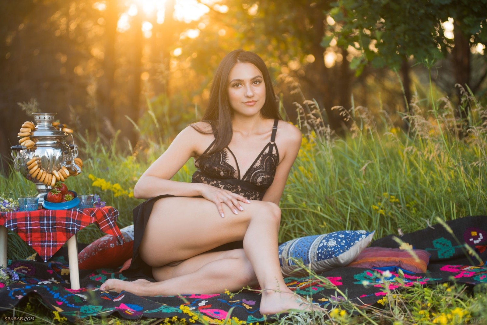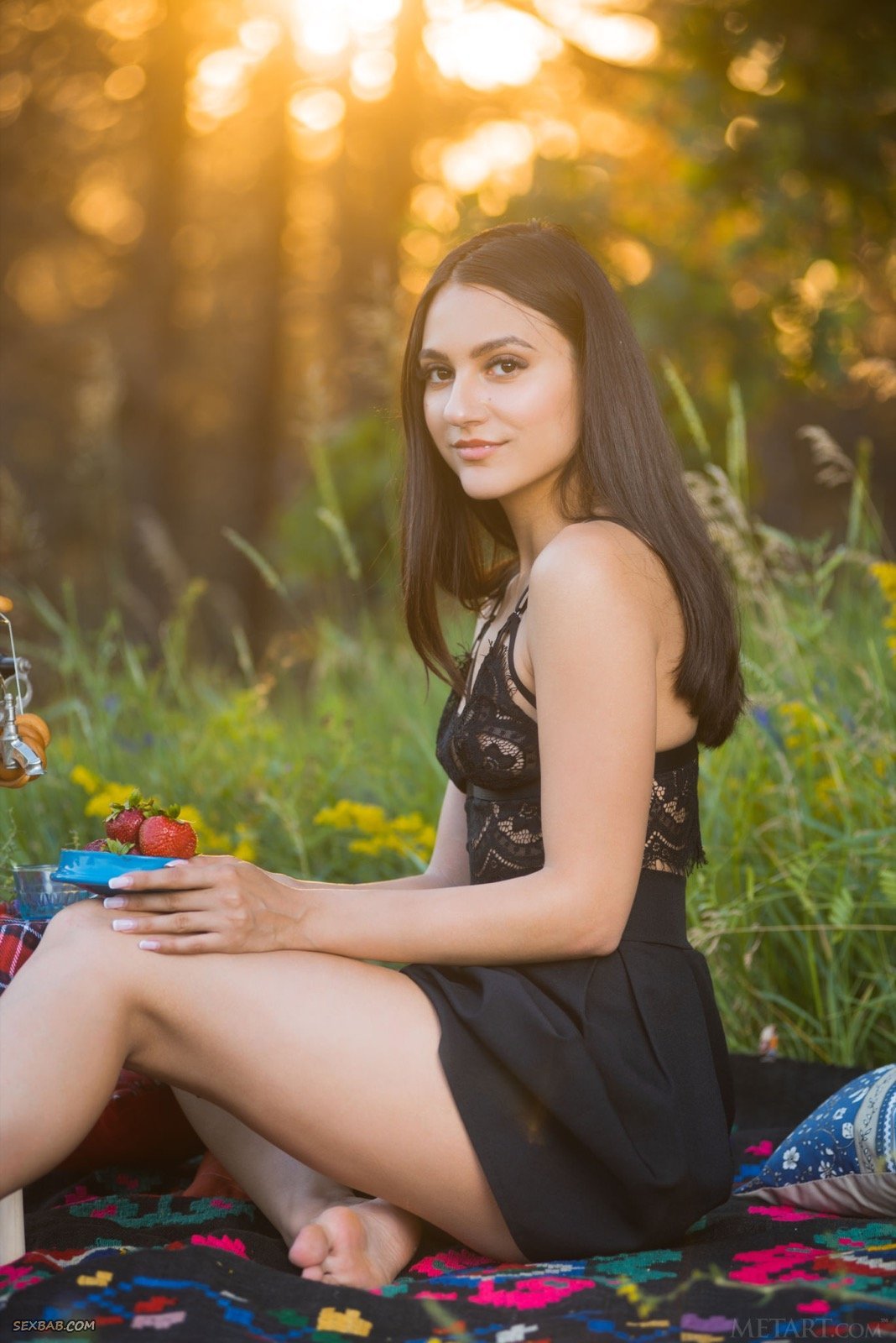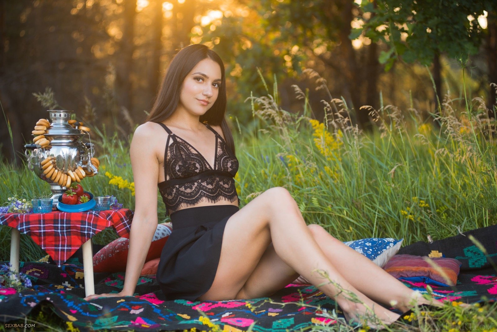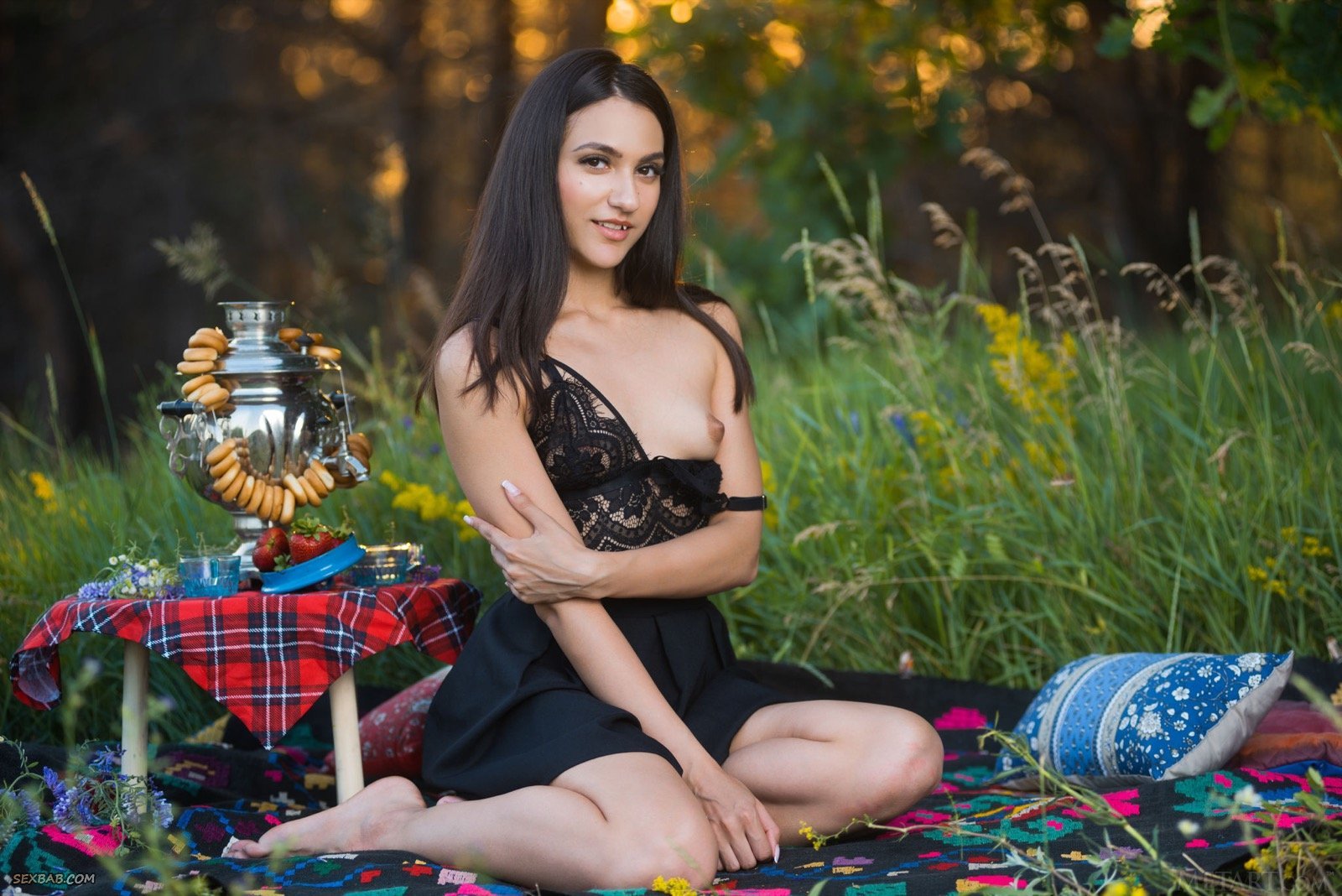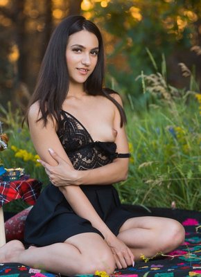 Описание: Выбравшись на природу и расположившись на подстилке, милашка в короткой юбке и кружевной майке, меняя эротичные ракурсы, хвастается перед фотографом шикарной задницей. А раздевшись до гола, брюнетка с маленькими сиськами подробно демонстрировала бритую письку с гладким лобком.