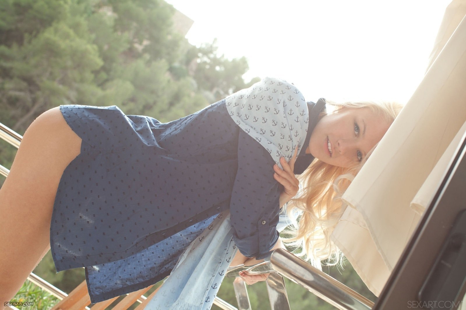 Описание: Устроившись на балконе, очаровательная блондинка в трусиках и рубашке начинает эротично позировать и часто менять ракурсы. В дальнейшем сексуальная девушка с плоским животиком все же сняла нижнее бельё и подробно продемонстрировала бритую письку, широко раздвигая промежность.