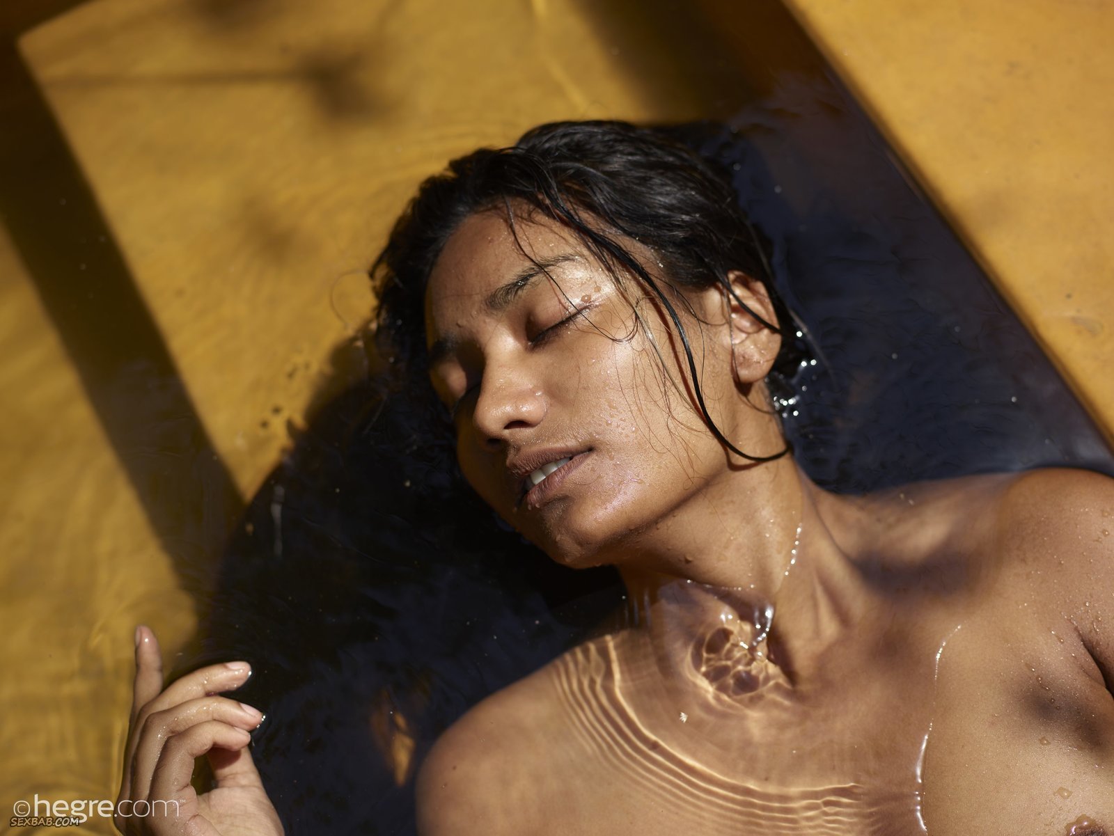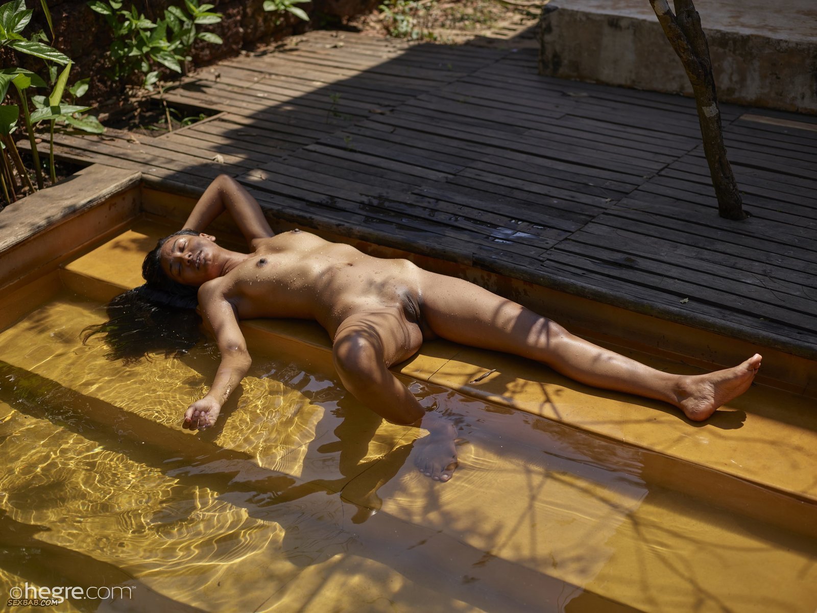 Описание: Очаровательная смуглая девушка со стройной фигурой, наслаждаясь солнышком рядом с домом, медленно начинает снимать купальник, а после намочилась в бассейне. В процессе красотка лежит на спинке в воде и демонстрирует мокрые сиськи с торчащими сосочками, а так же влажную бритую письку, в будущем так же не забывая показывать попочку.