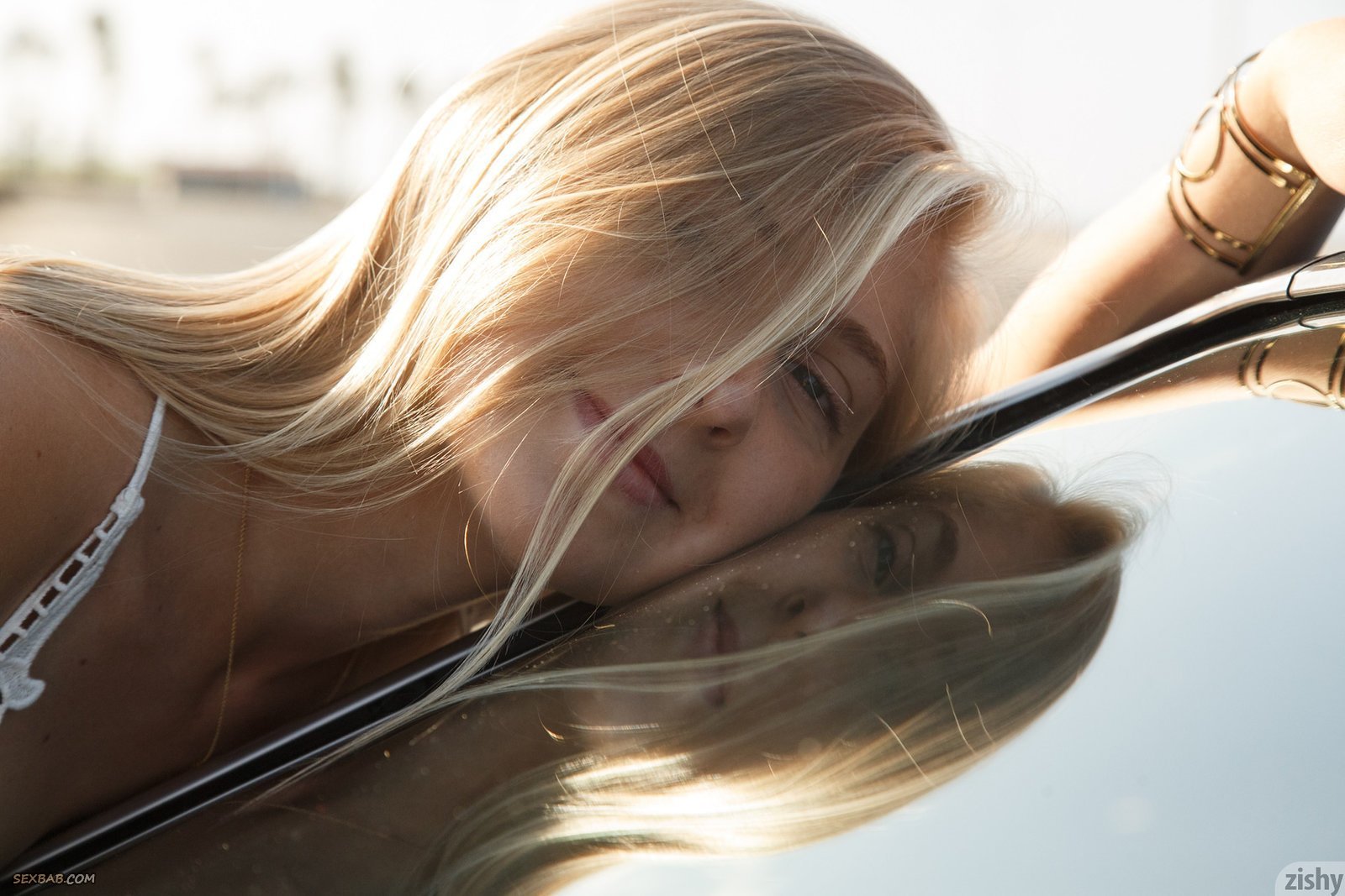 Молодая светловолосая девка позирует у машины
