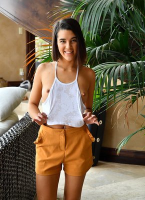 Описание: Начав позировать в майке и шортиках, молоденькая девица с загорелой кожей, в процессе все же начинает раздеваться и демонстрировать маленькие сиськи. В дальнейшем, очаровательная и достаточно сексуальная стройняшка присаживается на диванчик и раздвигая промежность показывает гладко выбритую письку.
