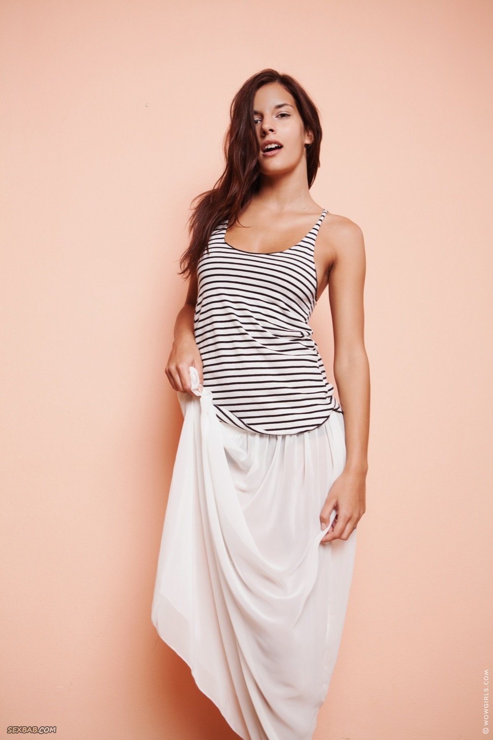 Описание: Обворожительная девушка с длинными каштановыми локонами и пирсингом на пупке в тельняшке и юбке эротично позирует на фоне стены, ощущая от процесса возбуждение, параллельно раздеваясь догола. Обнаженной стройная шатенка с радостью продемонстрировала натуральные сиськи и бритую письку с аккуратной прической на лобке.