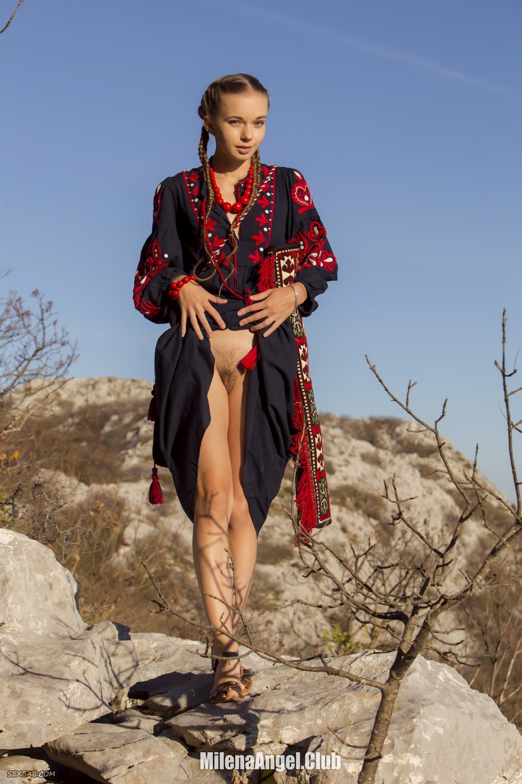 Описание: Гуляя в горах и наслаждаясь теплым днем, девушка в народном платье без трусов устраивается на ковре, лежащем на скале, и подробно показывает письку с волосиками вокруг половых губ и на лобке. Нежно трогая промежность пальцами, стройняшка грациозно поднимала ноги вверх, обхватывая их руками.
