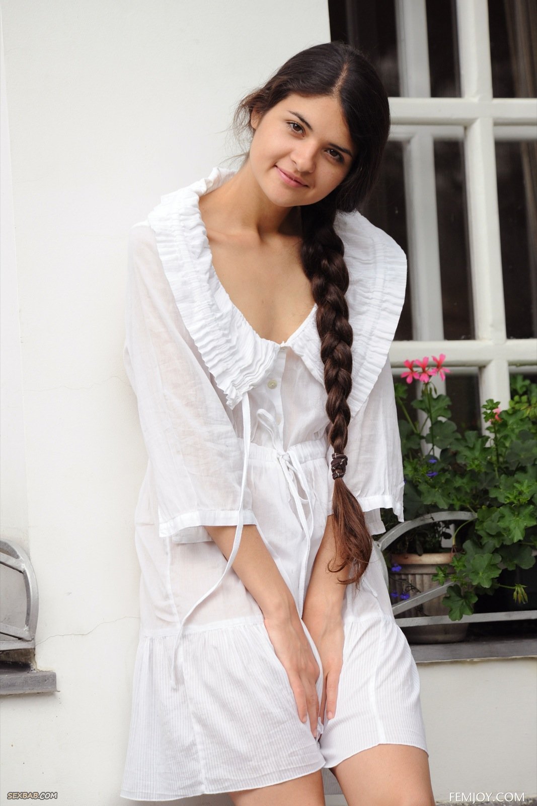 Описание: Привлекательная молодая девка с миниатюрными сиськами, скинув полупрозрачное бело платье, эротично позирует рядом с загородным домом. Улыбаясь и теребя косичку, стройная красотка засвечивает лобок с волосиками и бритую письку, а повернувшись спиной упругую попку.