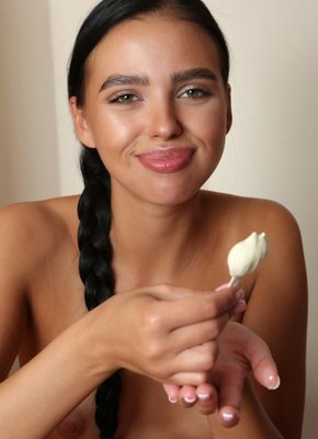Описание: Усевшись на тумбочке, абсолютно голая и невероятно сексуальная брюнетка с длинной заплетённой косой и пухлыми губками соблазнительно лижет мороженное перед камерой. Между тем, красавица охотно позволяет нам полюбоваться её небольшой грудью и прочими прелестями обнажённого тела.
