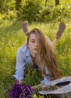 Описание: Накинув на голое тело рубашку и надев шляпку, молодая худая девица с заросшим лобком и милой внешностью начинает эротично позировать на природе, наслаждаясь и чередуя разные возбуждающие ракурсы. В процессе стройная красотка с маленькой грудью подробно демонстрировала попку и бритую письку.