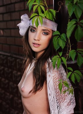 Описание: Обаятельная молодая красотка в одних только кружевных колготках белого цвета на голое тело эротично позирует без трусов у загородного дома и в процессе раздевается. Устраиваясь обнаженной на подстилке, стройная девушка с маленькой грудью особенно часто прогибалась раком и раздвигала ноги, позволяя нам увидеть бритую письку с прической на лобке и попку.