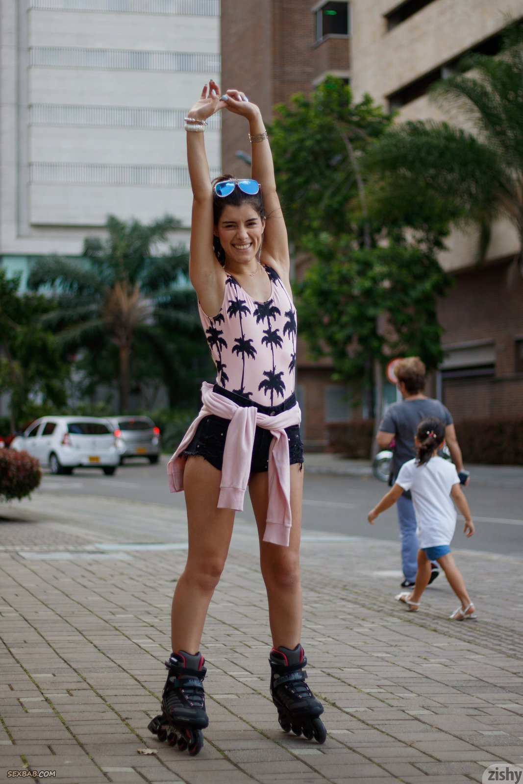 Описание: Часто улыбаясь, привлекательная молодая девушка в коротких шортах, катаясь на роликах по улице, старается эротично позировать и порой немного оголять сексуальные части тела. Особенно подробно стройняшка с тонкой талией демонстрировала задницу и маленькие сиськи с набрякшими сосочками.